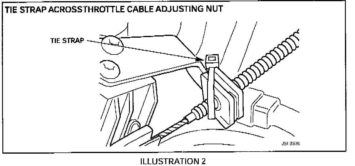 2. All models: Looking into the engine compartment when standing by the left hand front wheel, examine the throttle cable adjusting nut and its bracket. If an existing tie-strap is present as in illustration 2, no further action is required. If no tie-strap is present (as in illustration 1) proceed as follows: