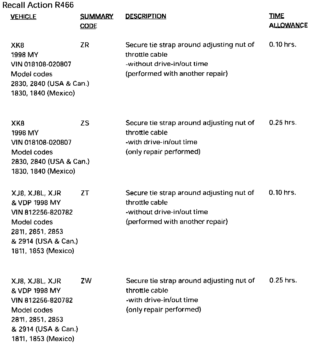 A simple modification, as introduced in production on both XK8 and V8 XJ Series Sedan models at the VINs immediately following the VIN ranges listed above, is required to prevent possible movement of the adjusting nut. This involves a check of the routing of the throttle cable and ensuring positive location of the adjusting nut in the bracket.
