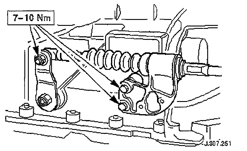 12. Connect the selector cable to the selector lever and fit the abutment bracket to the transmission casing. Tighten the nut and two bolts to the specified torque figure.