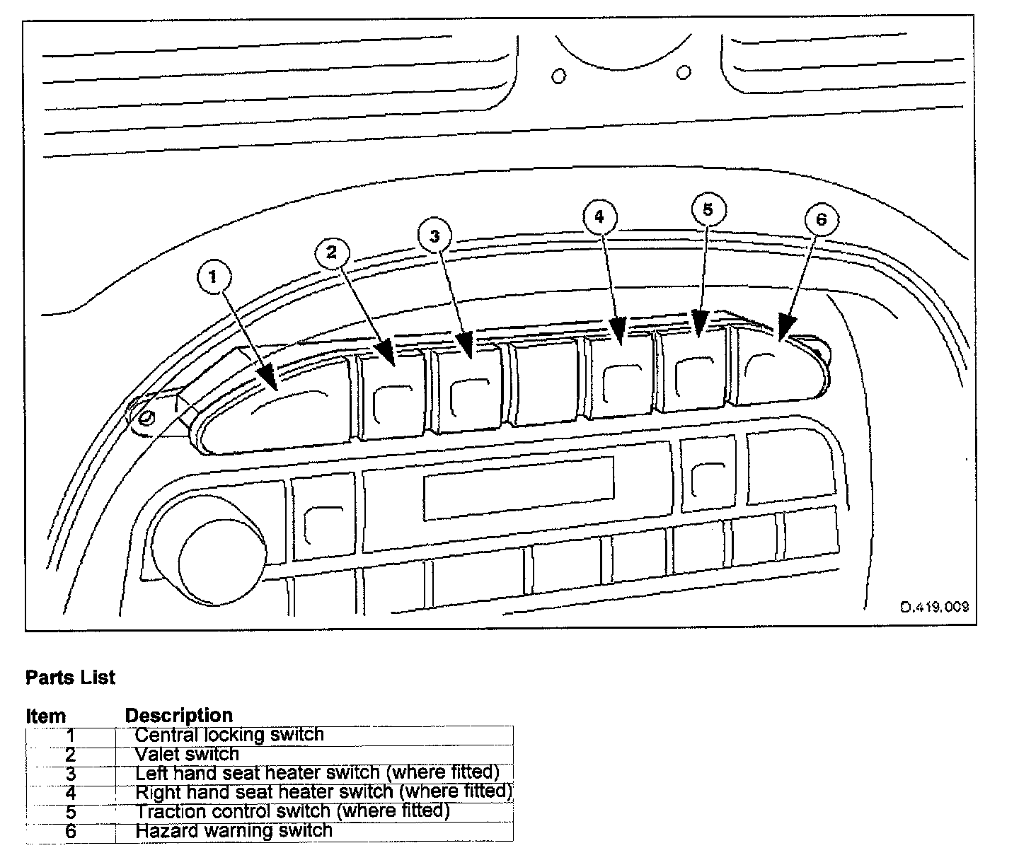 The Centre Console Switch Module comprises the integral switches identified in the image above. All switches with the exception of the Traction Control Switch are connected to BPM inputs. The Traction Control Switch is connected to an ABS unit input.