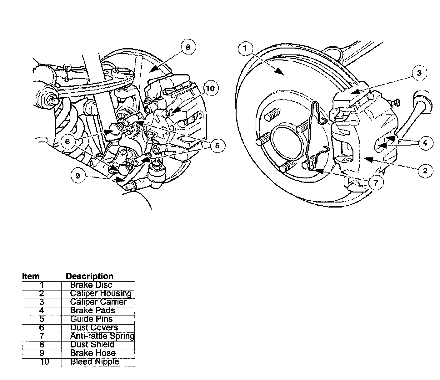 The caliper carrier, which is secured to the vertical link by two bolts, carries the single-piston caliper housing. The caliper housing is secured to the caliper carrier by two guide-pins and an anti-rattle spring. When the brakes are applied the caliper-housing piston pushes the brake pad in front of it, towards the brake disc. This movement forces the caliper housing to move along the guide-pins, in the opposite direction of the piston, to apply the second brake pad. The brake disc is therefore gripped between the two pads. As brake pressure is increased the grip on the brake disc is increased to slow-down the rotation of the road wheel.