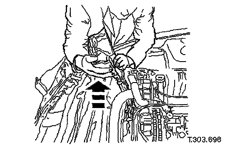 Standing at the right hand side of the vehicle, rotate and maneuver the cover upwards to clear the water pump and hoses.