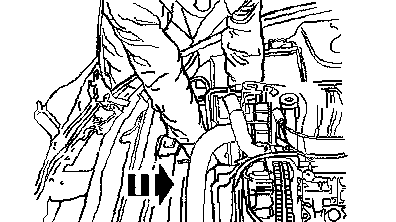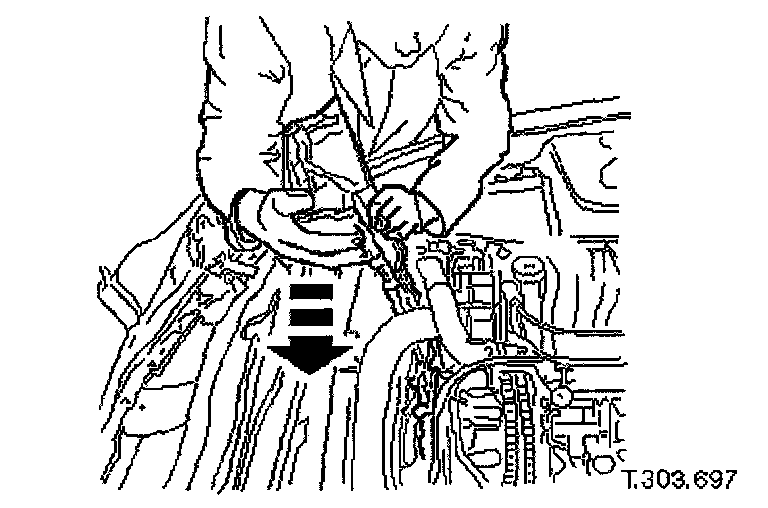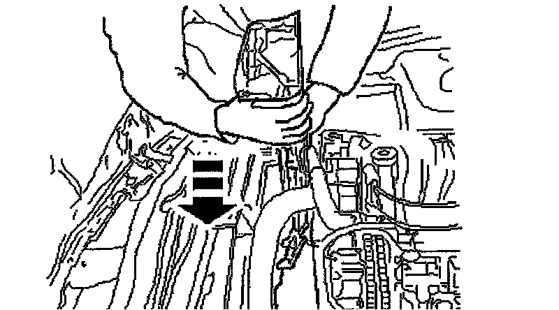 Standing at the right hand side of the vehicle, rotate and maneuver the cover downwards to clear the water pump and hoses.