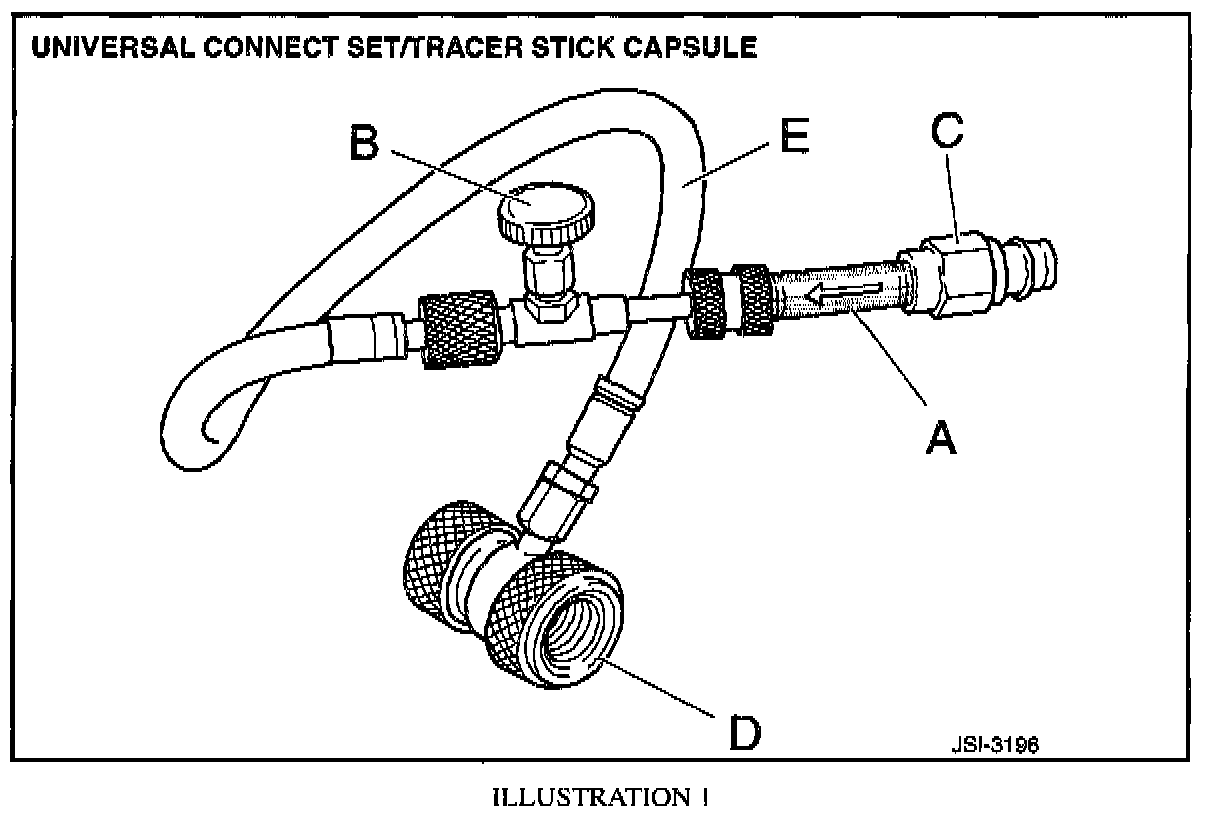 ^ The Universal Connect Set and Tracer Stick Capsule are used to introduce dye into the Air Conditioning systems of vehicles which were produced with systems charged with R134a, without the need to discharge the refrigerant.^ Evacuate or purge the Universal Connect Set hose assembly. Close all valves finger tight, do not apply force or damage may be caused to the valve seat.