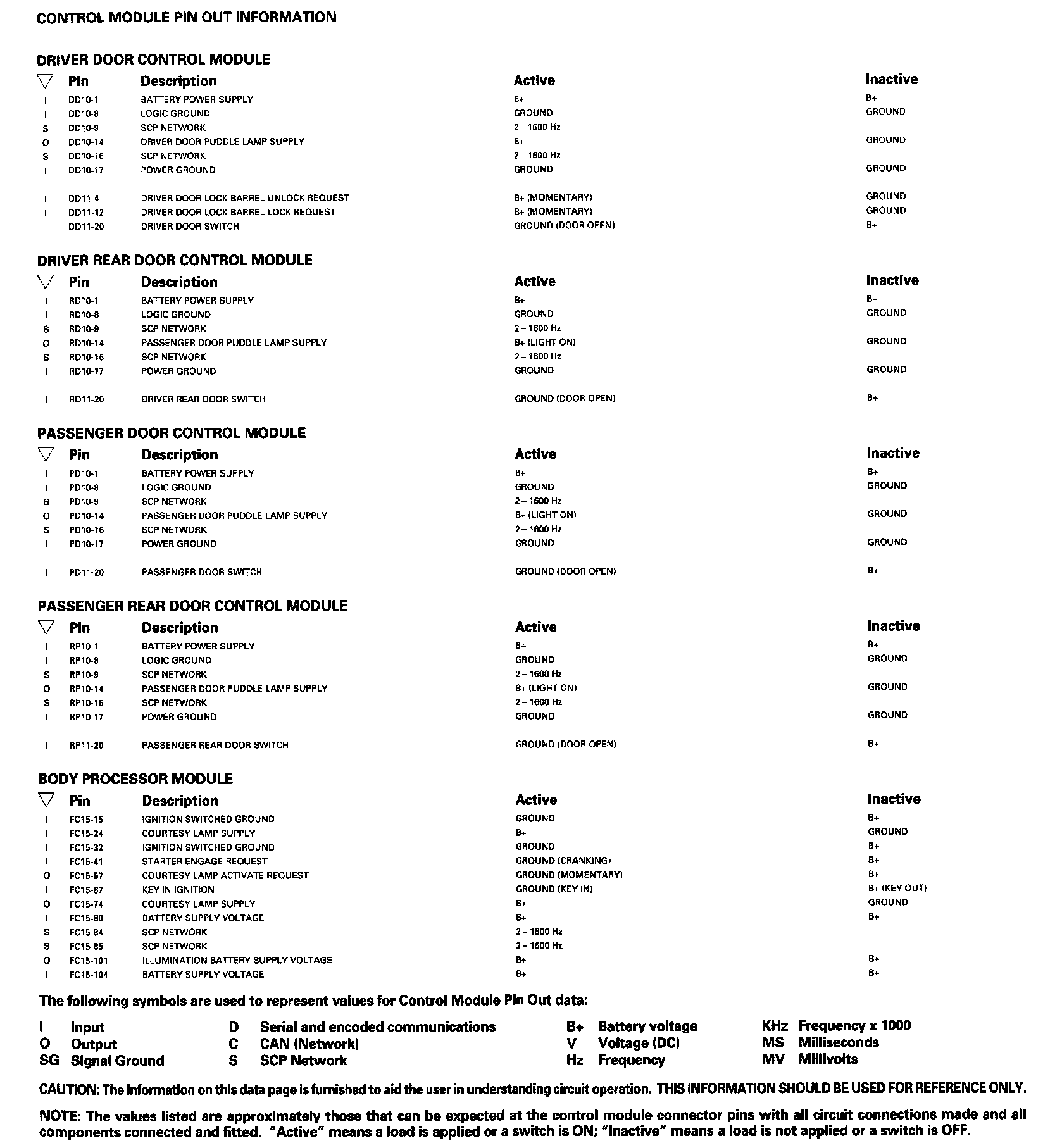 Control Module Pin Out Information: