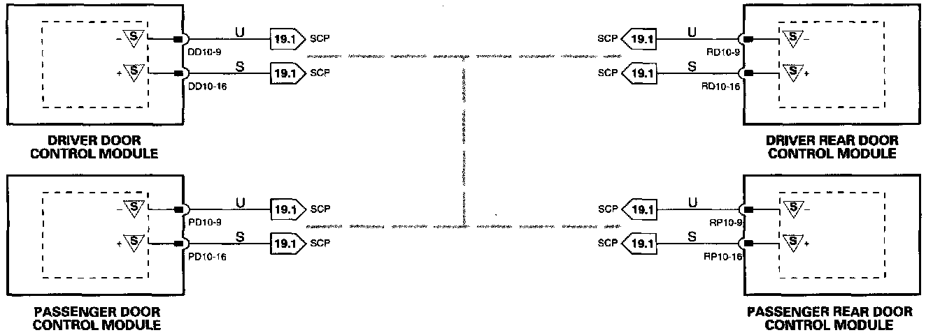 Due to circuit complexity and because space is limited, the SCP Network is, in most cases, shown as a broken grey line indicating that there is network communication between the depicted control modules. Refer to Fig. 19.1 for circuit details. Fig 19.1