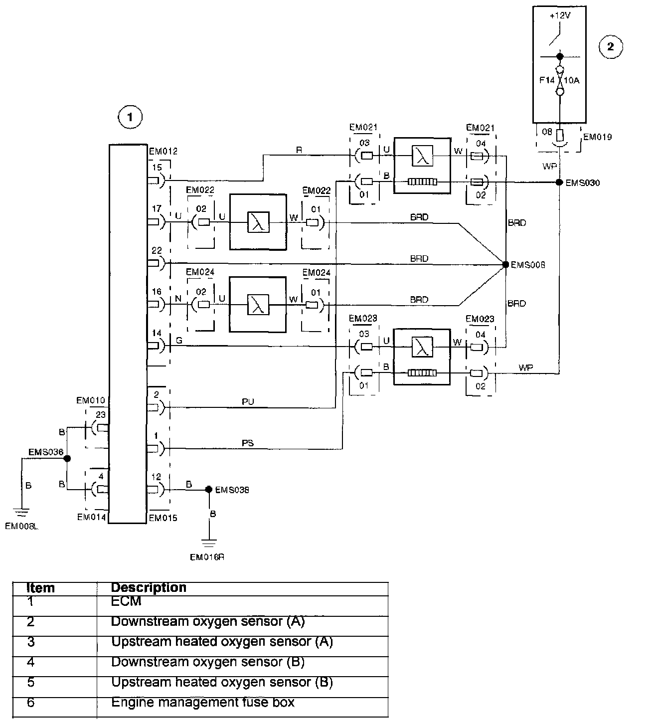 The upstream heated oxygen sensor is located at the catalytic converter inlet and detects the concentration of oxygen in the raw exhaust gases; an internal heater reduces the warm up time of the sensor output.