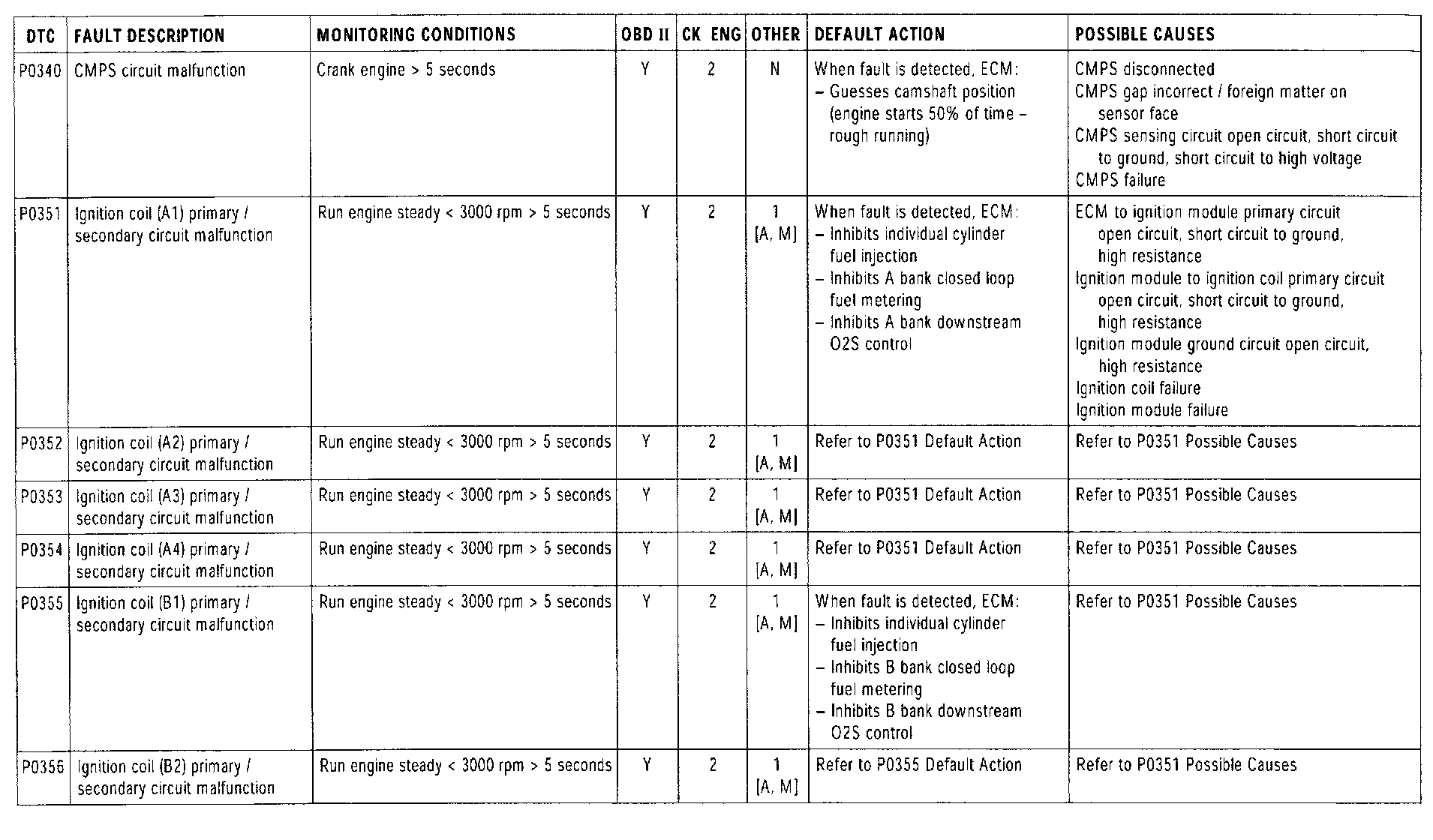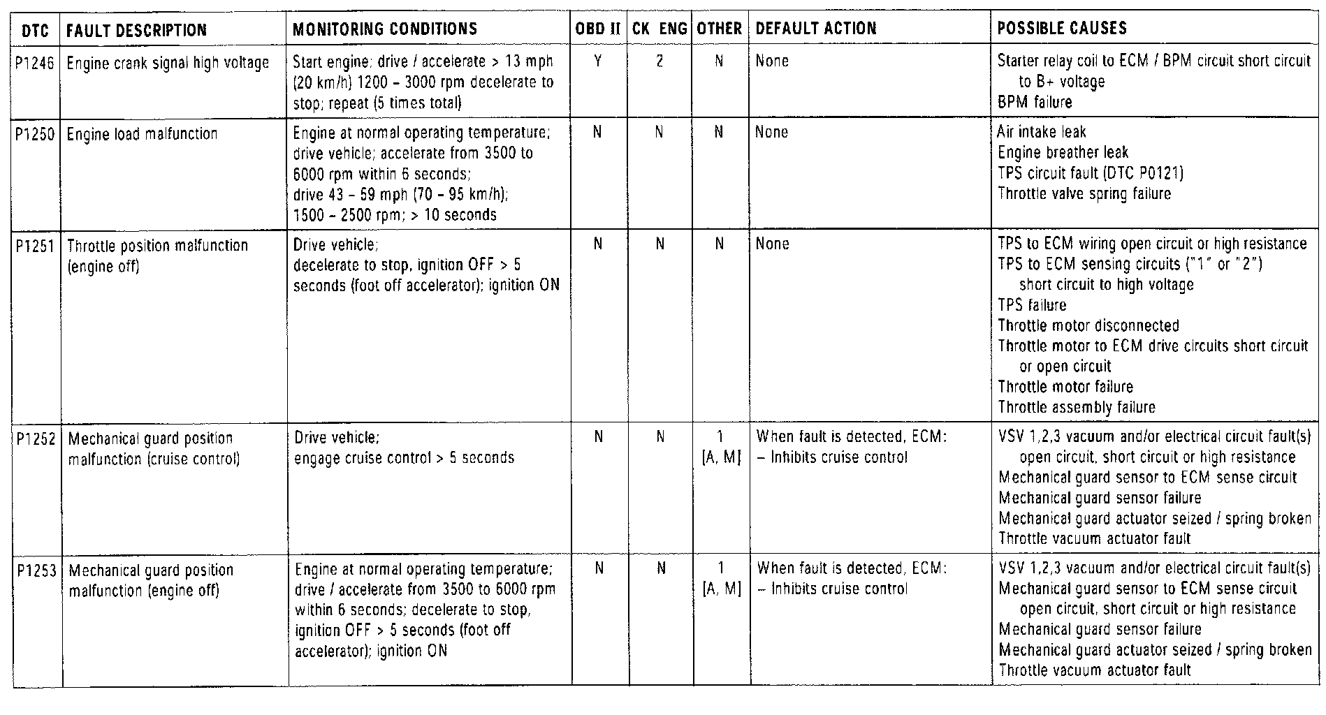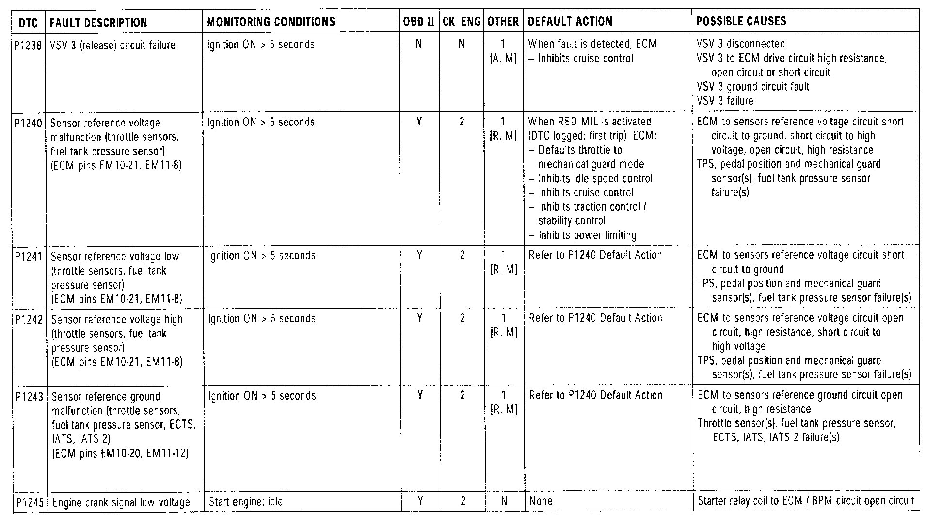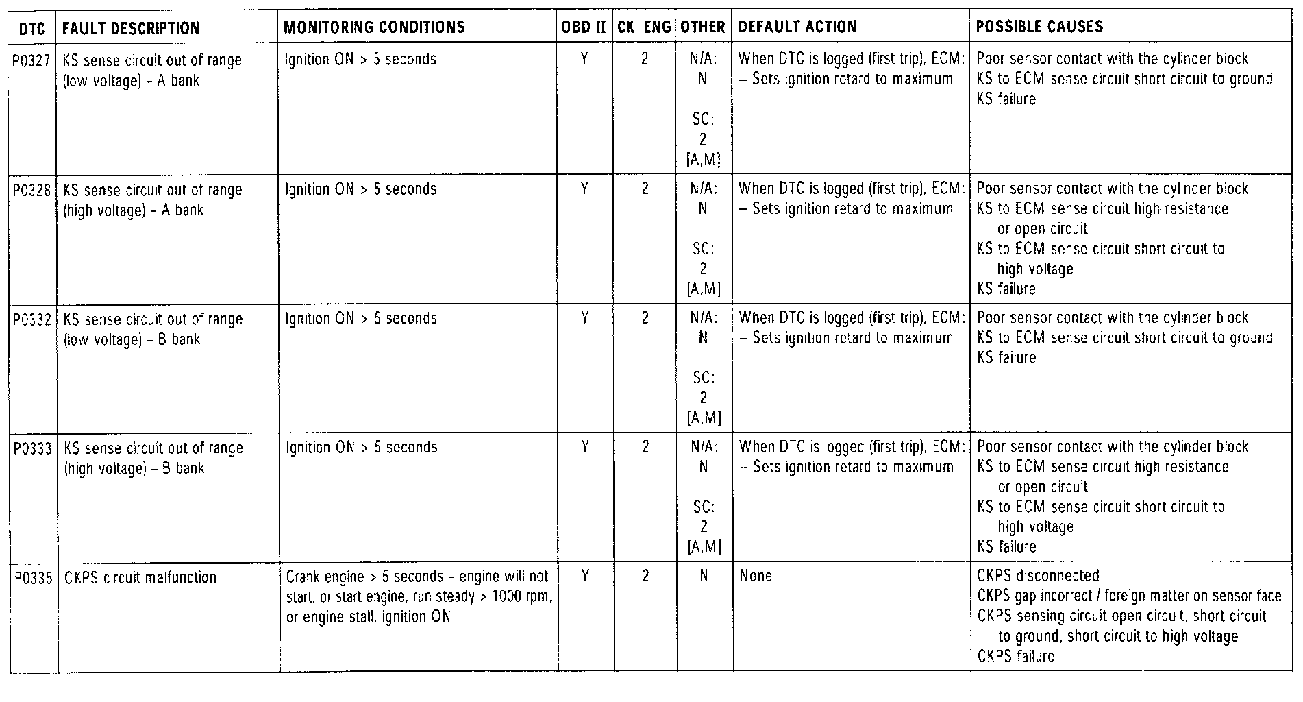 NOTE: For additional "P" Codes not listed in this summary, refer to the Transmission Control DTC Summary. For code P0335, refer to the climate control system trouble code summary.