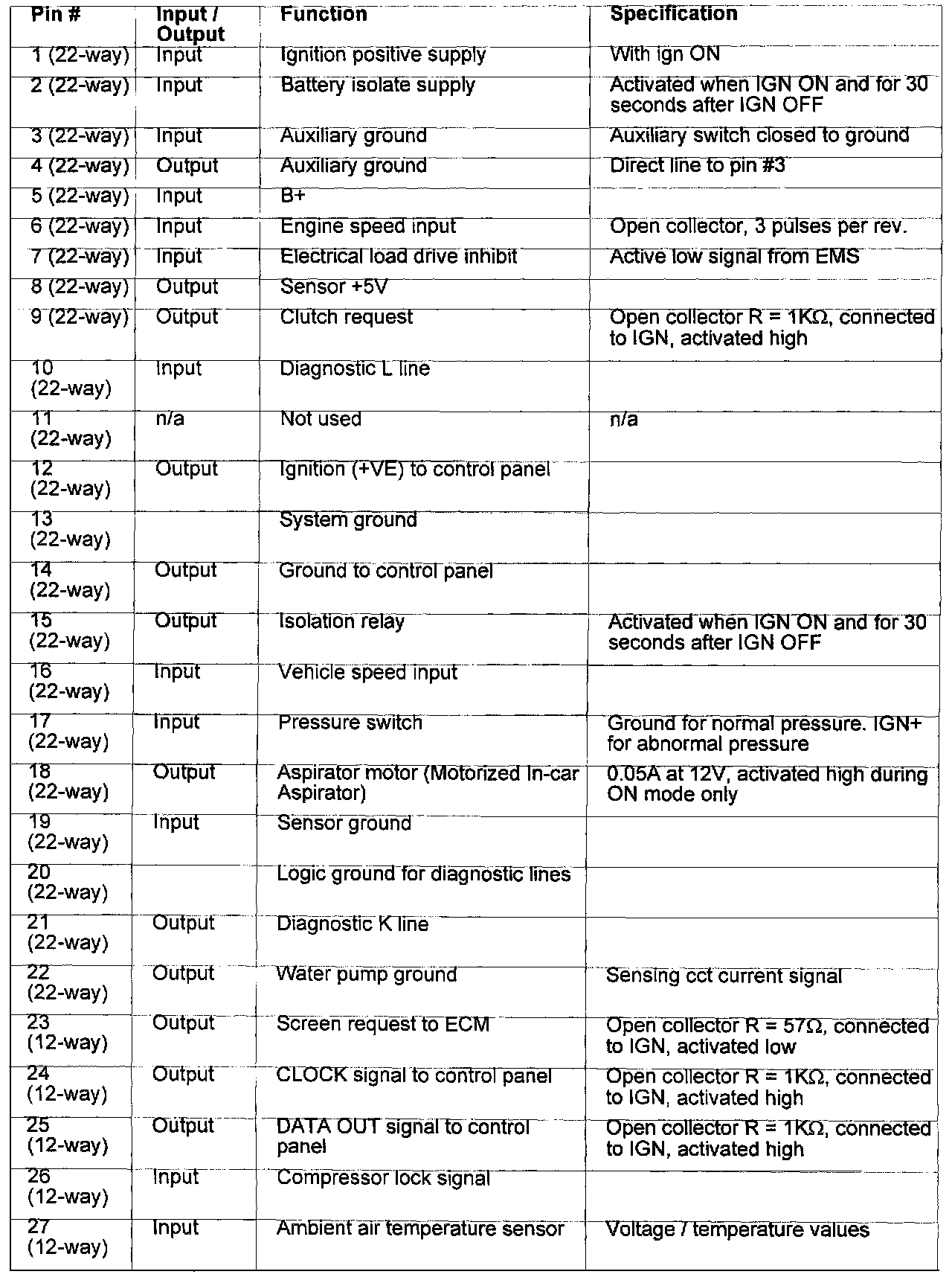 Pin # 1 (22-Way) - 27 (12-Way):
