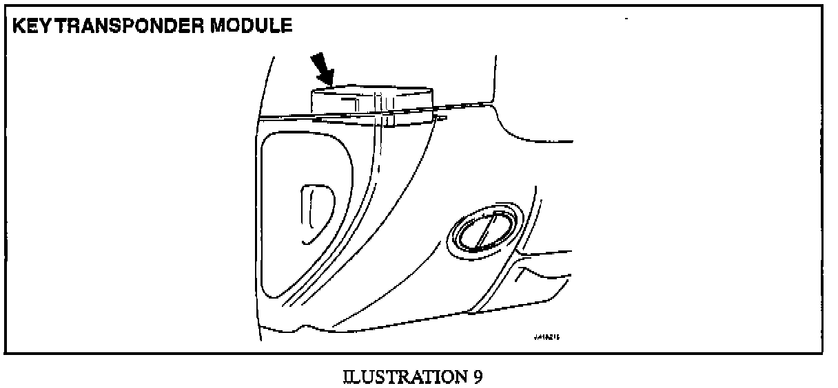 A key transponder control module (KTCM) installed in the fascia (illustration 9) is linked to the BPM, the ECM and a reader/exciter coil around the ignition switch. The KTCM is programmed to recognize a uniquely coded transponder in the head of each key supplied with the vehicle.