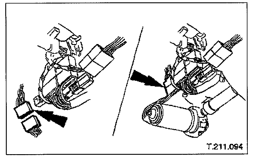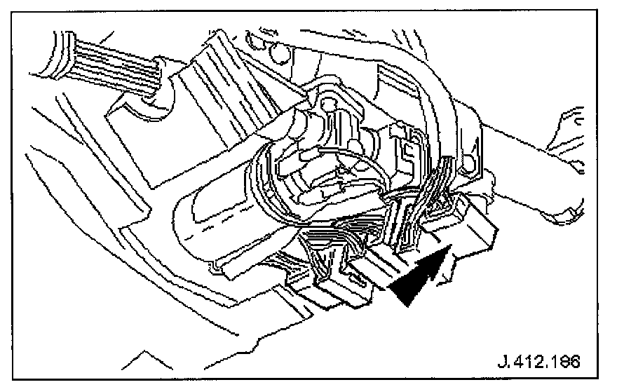 26. Remove steering column tilt adjustment motor harness multiplug from retaining bracket and disconnect multiplug.