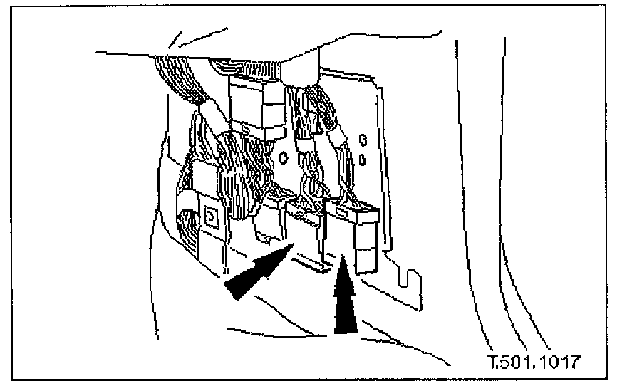 71. Release facia harness multiplugs from retaining brackets on RH side of facia and slacken and remove two nuts securing harness to facia.