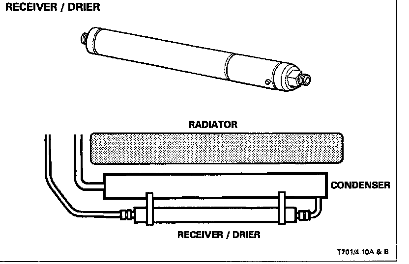 The receiver / drier, vertically mounted at the top right-hand side of the condenser, stores liquid refrigerant to allow for changes in evaporator demand. In addition, it's fitted with the high-side charge port, filters the refrigerant, removes moisture and includes a fluorescent tracer dye mechanism to aid leak detection. Due to the characteristics of R134a, no sight glass is provided.