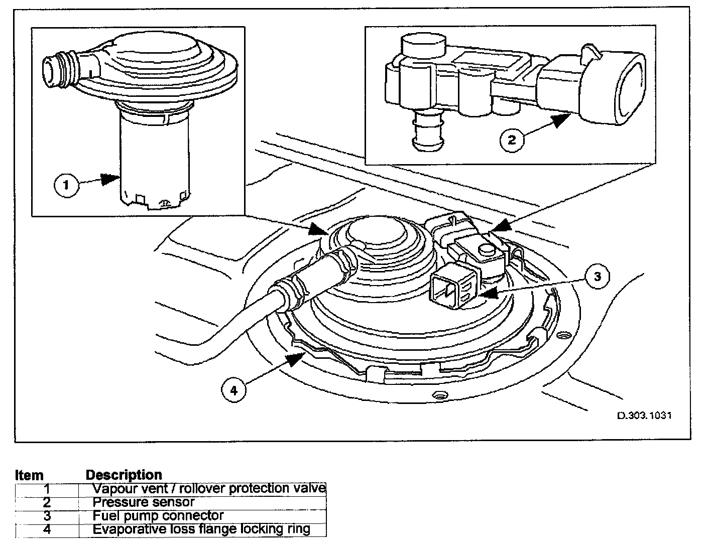The fuel pressure sensor is fitted to the evaporative loss flange and provides a voltage to the ECM which is proportional to tank vapour pressure.