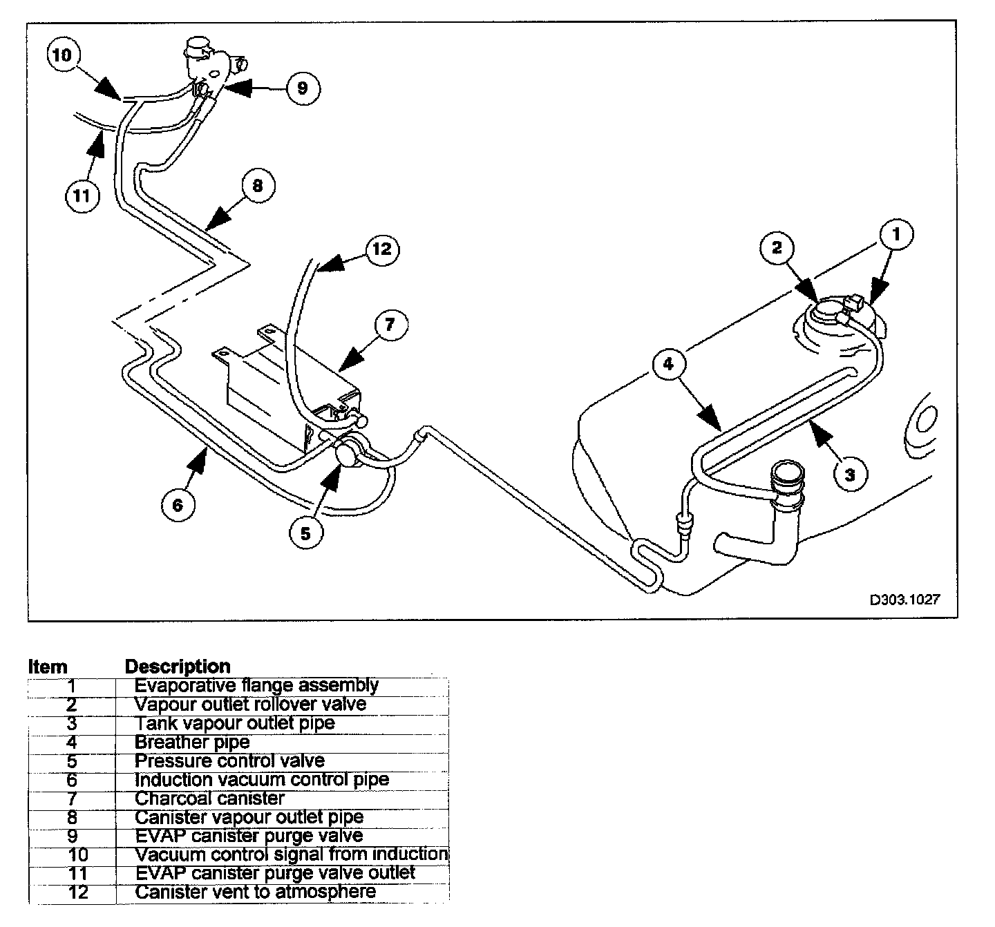 This system uses a single charcoal canister with a pressure control valve between the canister and the fuel tank vapour outlet. A vacuum control pipe is connected from the engine intake induction elbow to the pressure control valve. The vapour outlet from the fuel tank is taken via a safety rollover valve fitted to the removable flange at the top of the tank.