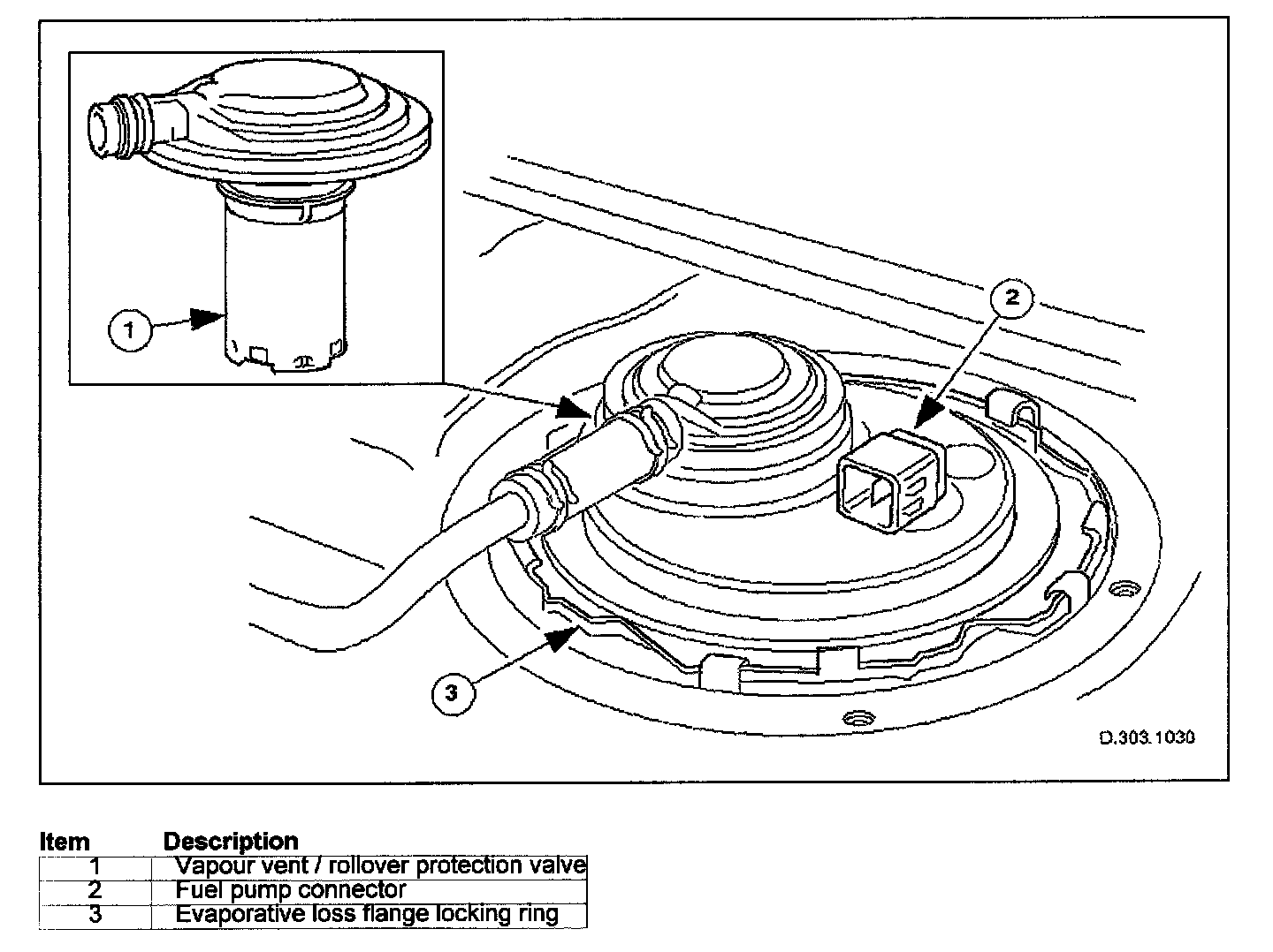 The vapour vent / rollover valve is a push fit via a sealing grommet. The fuel pump connector is push fitted and crimped into a location tube on the underside of the flange.