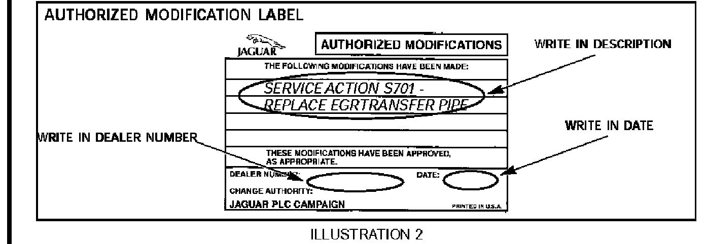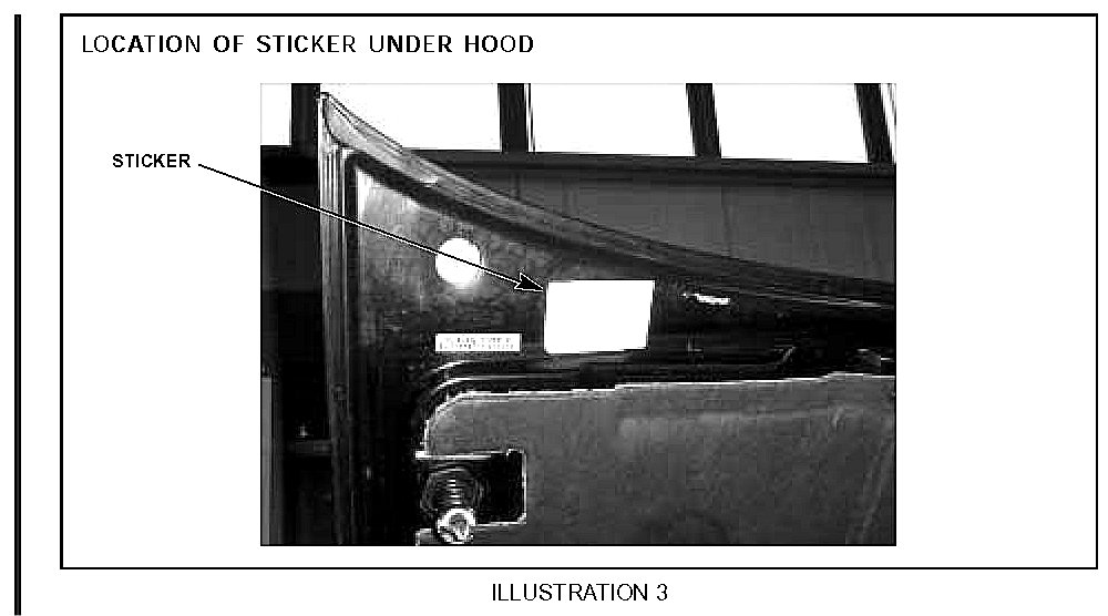 * Fill out an authorized modification label (Illustration 2), enter the dealer number and date an the authorized modification label and apply the label under the hood as shown in (Illustration 3).*