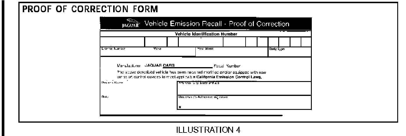 * California Dealers (and any other states where required): Fill out and place the salmon colored "Vehicle Emission Recall - Proof of Correction" form (Illustration 4, part no. S CAL RCL) in the vehicle glove compartment.*