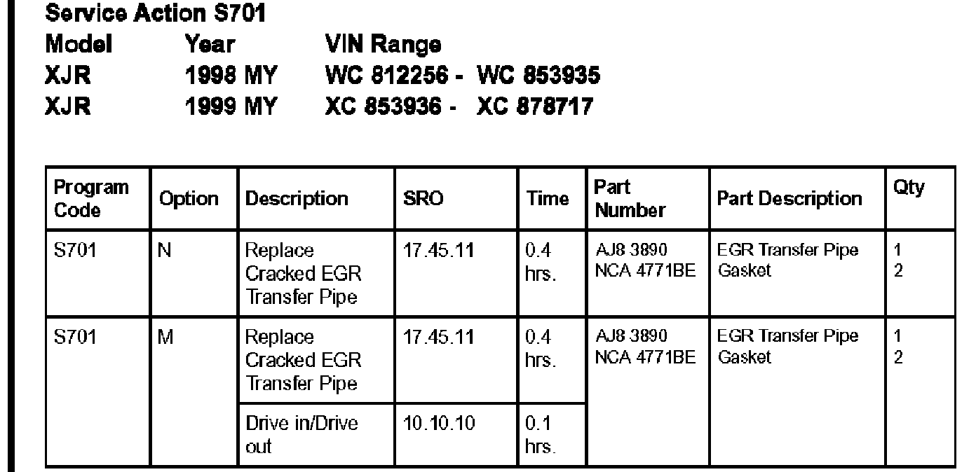 * This Service Action is being reissued due to low completion rates. As a result, Jaguar will be contacting customers directly.* Some 1998-99 MY XJR vehicles within the above VIN range may experience illumination of the check engine light and/or customer complaints of excess engine noise. This condition can be caused by a cracked EGR transfer pipe.