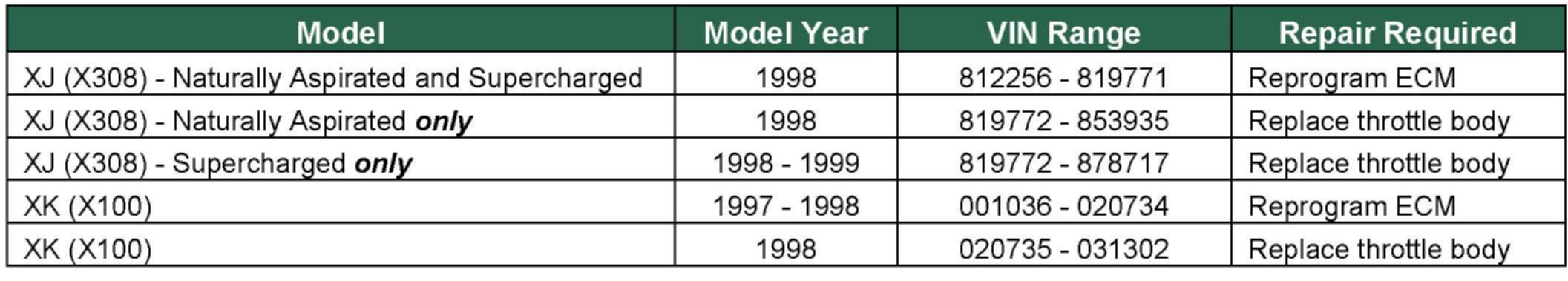 Perform this Service Action on all vehicles with the VIN ranges listed above, both in and out new vehicle warranty. To aid in the identification of repairs required by vehicle, the table above provides a breakdown by model, model year, and VIN range. Refer to the Repair Procedures outlined in this Technical Bulletin to either reprogram the Engine Control Module (ECM) or replace the throttle body.