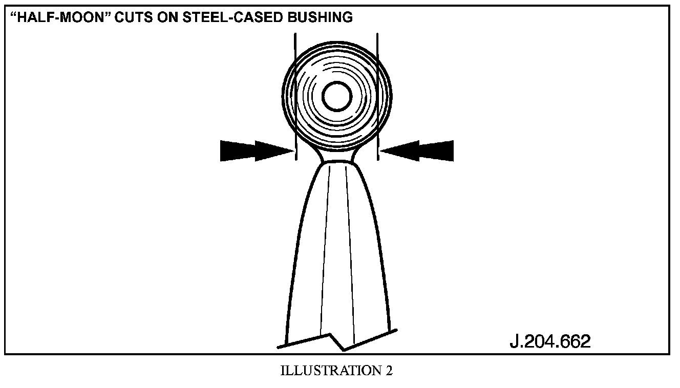 2. Inspect the front wishbone bushings. A raised circular rib around the circumference of the center steel core identifies the MNE 1360BB level bushing (Illustration 1).