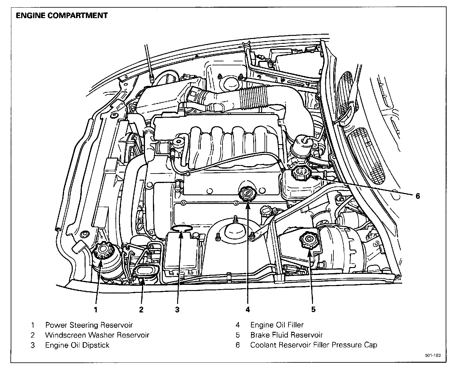 At the front left side of the engine compartment are located the windshield/headlamp wash reservoir filler, the power steering oil reservoir, left front fusebox and the brake control module.