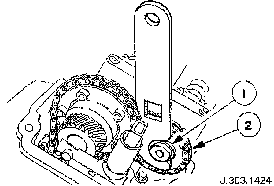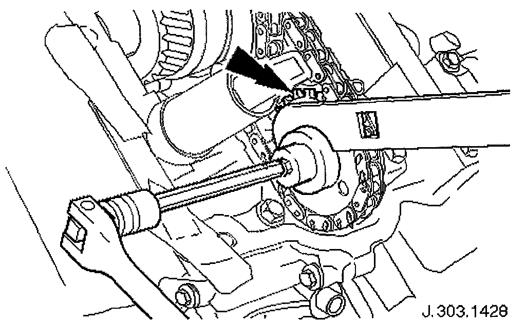 Adjust the position of the sprocket within the chain to allow the chain tensioning tool 303-532 to be approximately vertical, as shown.