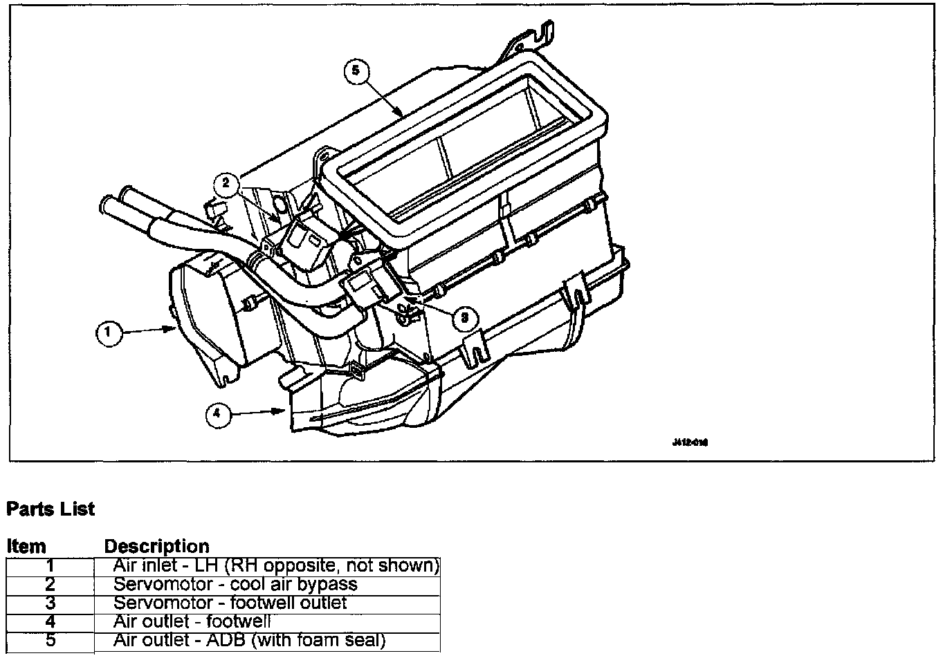 The air conditioning unit houses the evaporator, heater matrix and their temperature sensors. The unit also incorporates two servo motor operated air distribution flaps which regulate airflow to the front footwells and the quantity of airflow through the cool air bypass (air which by-passes heater matrix) up to the upper air distribution box (ADB)