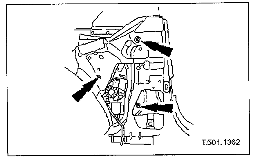 12. Remove three nuts securing glass lift motor/regulator assembly to body.