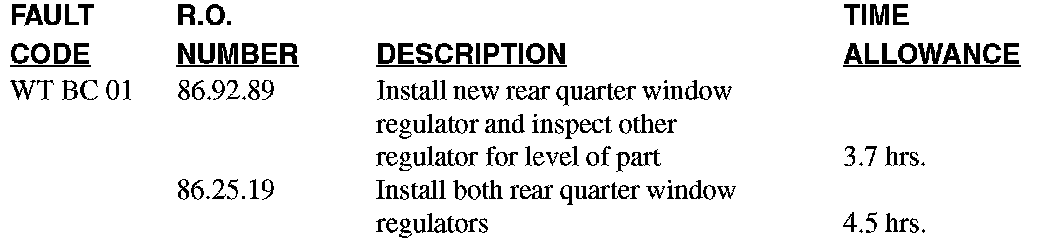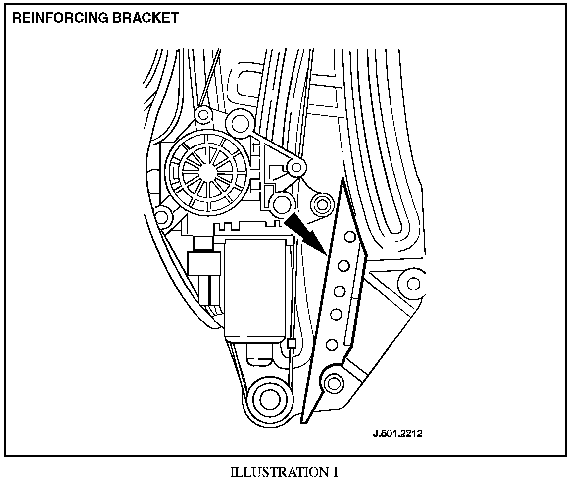 If only one side rear quarter window regulator has failed, inspect the opposite regulator to see if it is equipped with a reinforcing bracket (Arrowed area in Illustration 1.) If not replace both regulators.