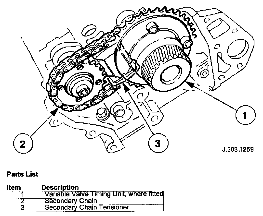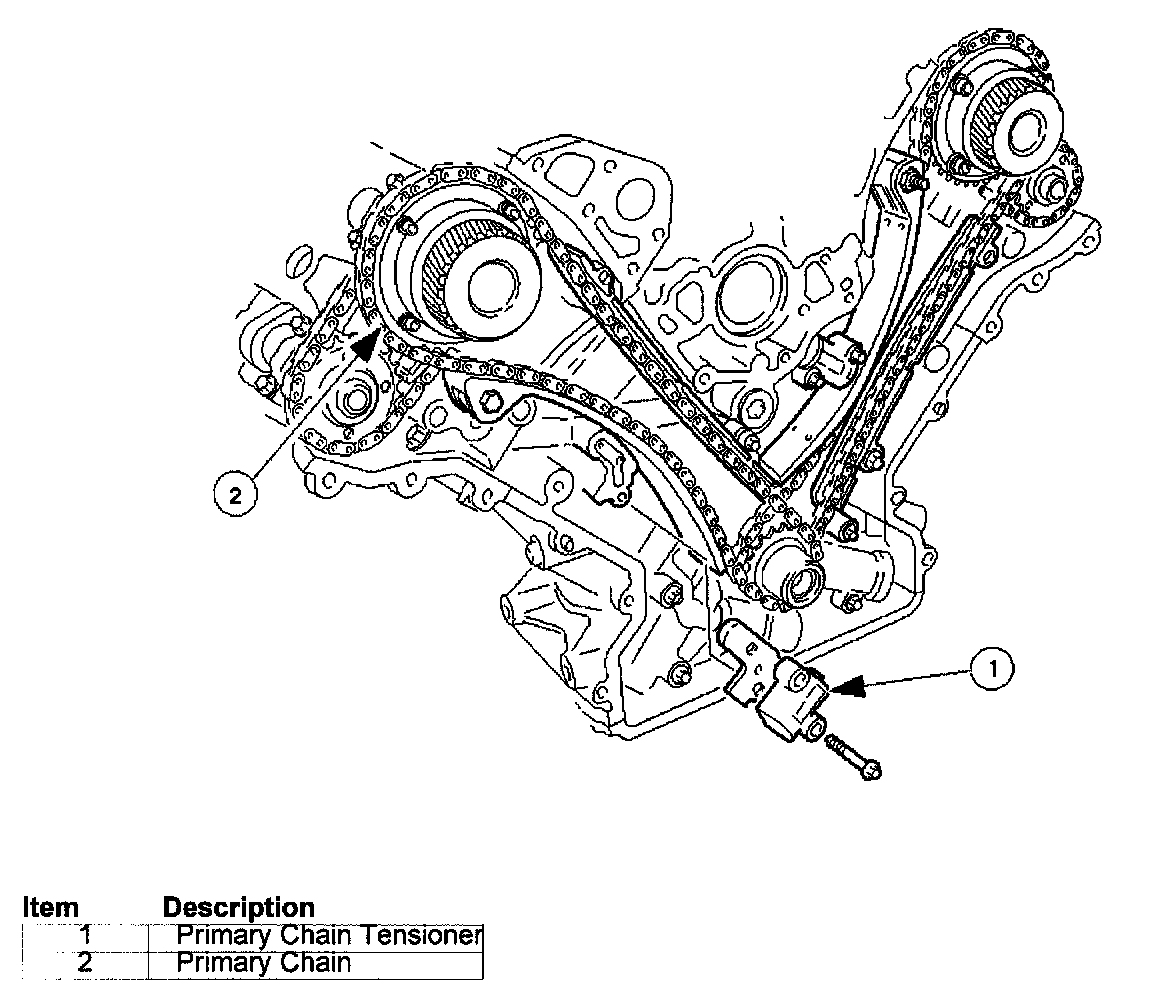 Single row primary and secondary chains drive the camshafts of each cylinder bank. The primary chains transmit the drive from two sprockets on the crankshaft to a sprocket on each intake camshaft. The secondary chains transmit the drive from a second, smaller sprocket on the intake camshaft to a sprocket on the exhaust camshaft.