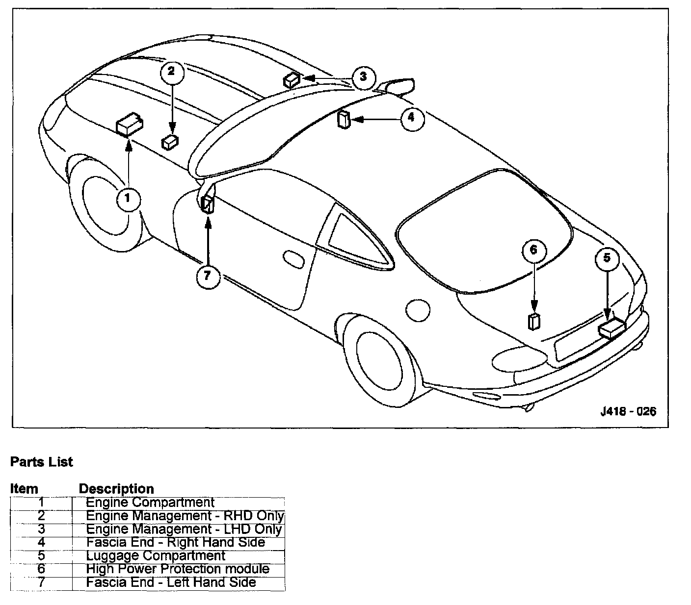 Two Engine Management fuse-boxes are shown. Only one is fitted (LHD or RHD) to any vehicle, on the opposite side to the pedal box.
