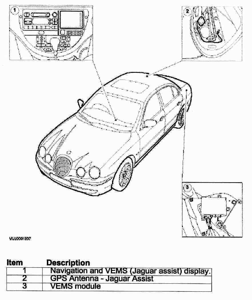 The complexity of the electronics involved with the Jaguar Assist system, of which the GPS antenna and navigation display are parts, and the multiplexed communication network which are connected to it preclude the use of workshop general electrical test equipment. Therefore, reference should be made to the PDU User Guide for detailed instructions on testing the VEMS unit.