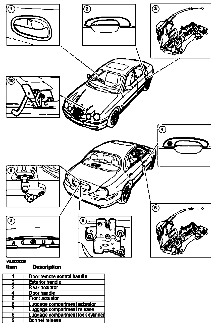 When the vehicle is not locked, each door catch can be externally released by the corresponding external door handle which operates via a single rod. When unlocked, or 'single action' locked, the door catches can also be released via the interior handles, each of which operates via a single cable. Operation of the front door interior handles will also unlock the rear doors. Use of the key in the external door barrel, operates the lock via a short rod to provide locking of the door latch. These locking functions can also be achieved by use of the remote transmitter. The luggage compartment can be independently unlatched via a switch located on the driver side lower panel. This will only operate at vehicle speeds below 5 mile/h (8 km/h)