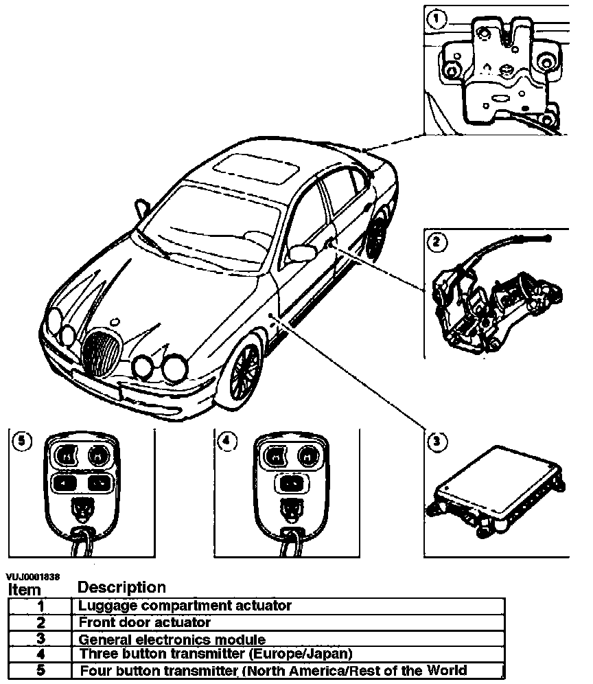 The remote control transmitter is housed separately from the ignition key and contains three buttons (LOCK, UNLOCK, LUGGAGE COMPARTMENT)or four buttons (LOCK, UNLOCK, LUGGAGE COMPARTMENT, PANIC).