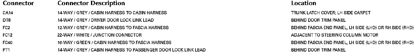 For detailed informations and illustrations regarding the location and identification of control modules pins, refer to Vehicle / Diagrams / Connector Views. Connector Views