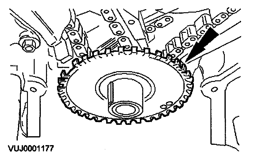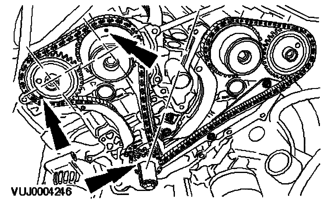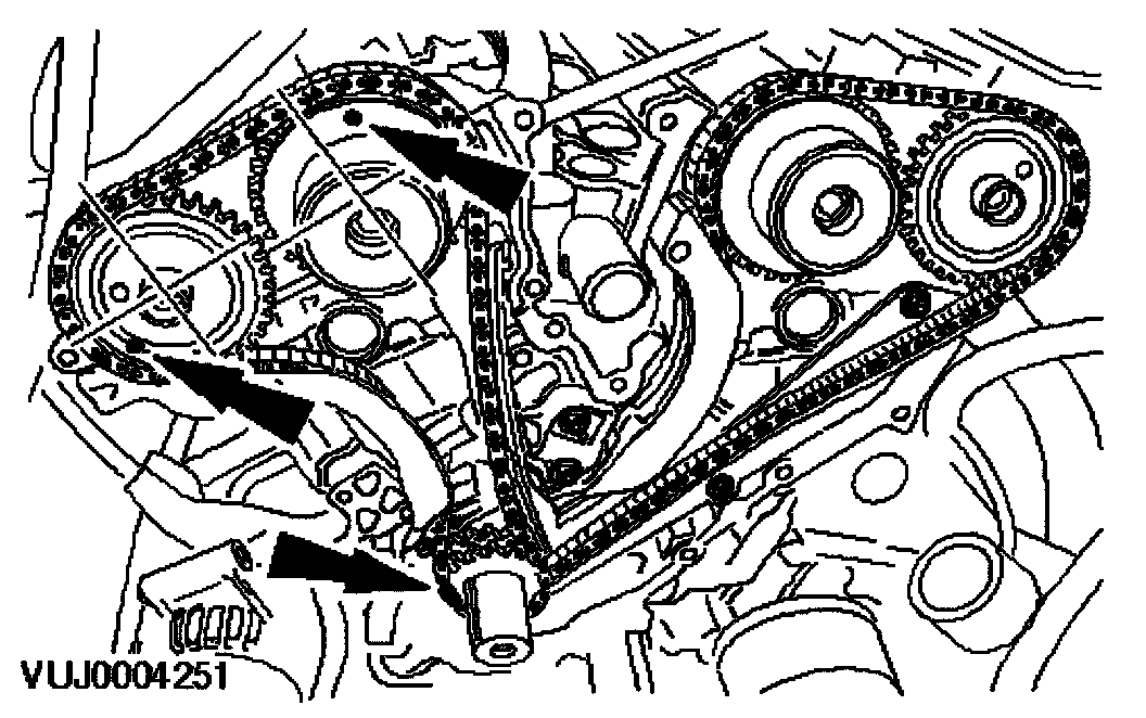 26. CAUTION: Make sure the right-hand timing chain alignment marks have remained correctly positioned to the camshaft sprocket and crankshaft sprocket alignment marks.