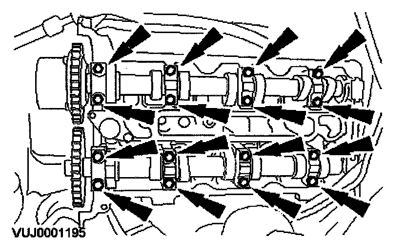 1. Remove the right-hand intake camshaft and right-hand exhaust camshaft bearing caps evenly.
