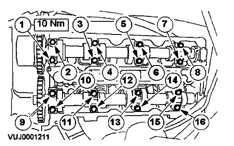 ^ Install the camshaft bearing cap retaining bolts evenly.