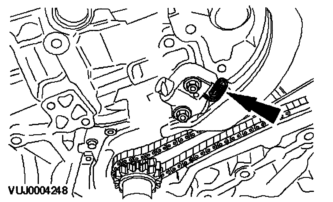 10. NOTE: The timing chain tensioner piston should retract with minimal force. If binding occurs, reposition the timing chain tensioner to eliminate side loading.