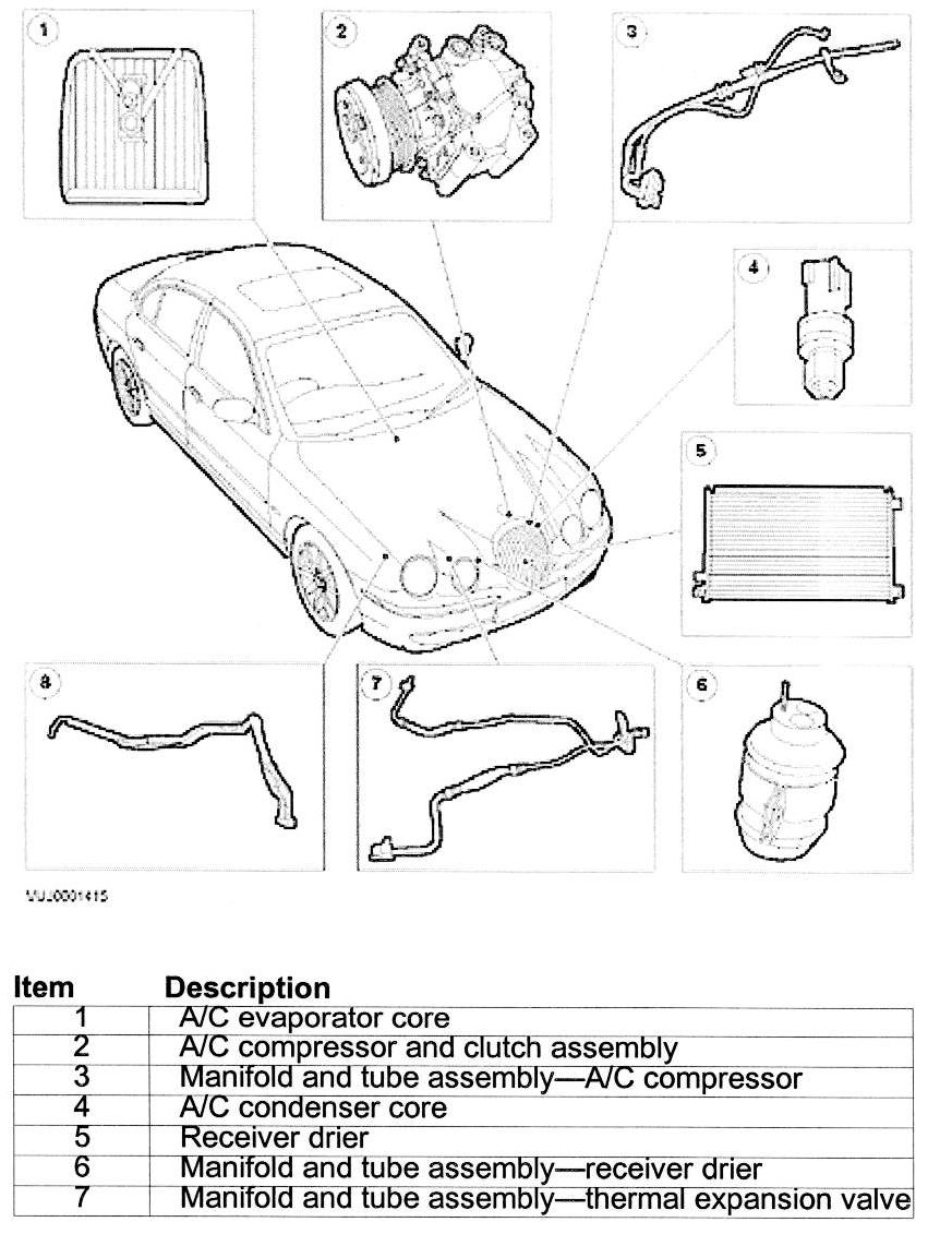 The air conditioning (A/C) system is a clutch cycling, thermostatic expansion valve type. The system components are:
