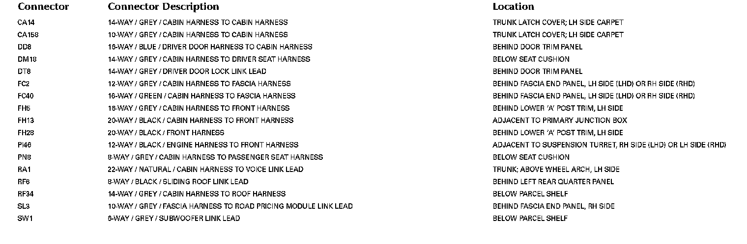 For detailed informations and illustrations regarding the location and identification of control modules pins, refer to Vehicle / Diagrams / Connector Views. Connector Views