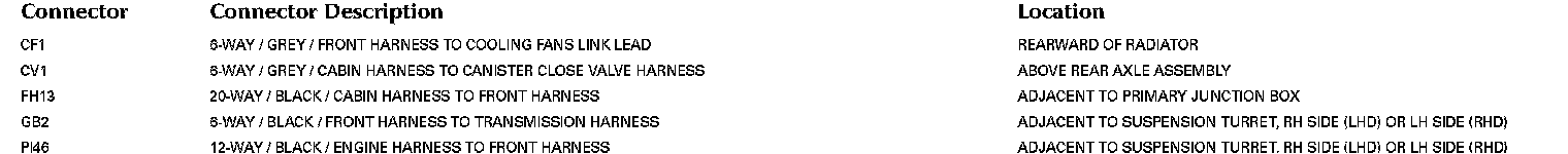 Refer to Vehicle / Locations for detailed information and illustrations regarding the location and identification of harnesses, relays, grounds and control modules. Locations