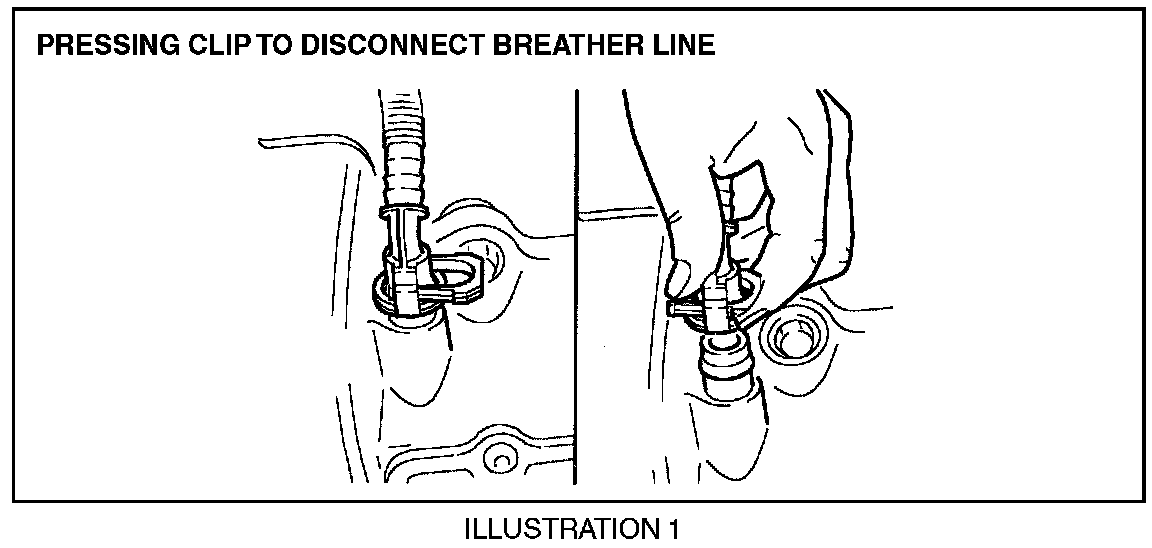 4. Depress the retaining clip (Illustration 1) of the connector of the part-load breather line, allowing the line connector to be disconnected from the breather stub on the left camshaft cover.