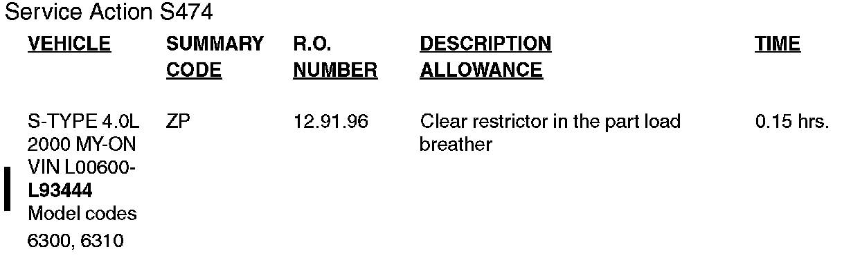 Until further notice, Jaguar Cars is introducing a routine cleaning procedure for this restricter. Initially this procedure should be performed at the first service opportunity on any S-TYPE vehicle, that has already covered more than 10,000 miles (16,000 Km). This cleaning procedure will then be performed at scheduled maintenance intervals of 10,000 miles (16,000 Km). The frequency of this cleaning procedure is shown.