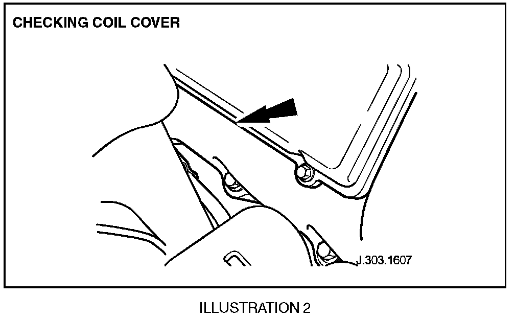 27. If the vehicle is 4.0L VB, visually inspect lower edge of the spark plug coil covers for water seepage. (Illustration 2). If the vehicle is a 3.0L V6, continue to step 28.
