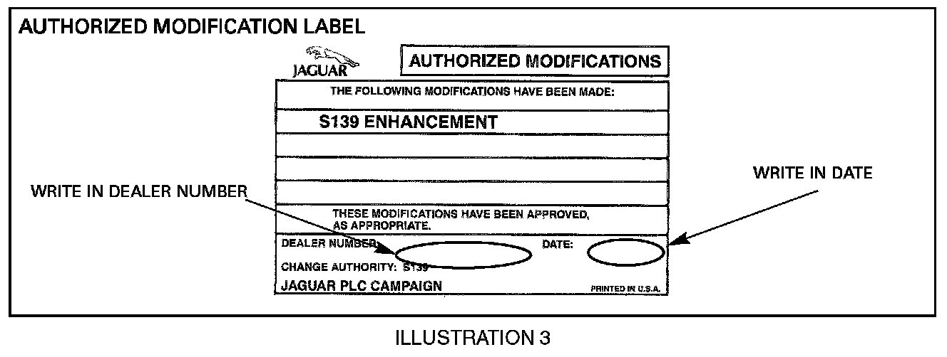 Enter your dealer number and the date on the Authorized Modification Label (Illustration 3). Apply the label to the left B-post below the striker. Then apply the clear sheet over the label. Place the label over any S129 label that might be present. Do not cover an S120 label if present.