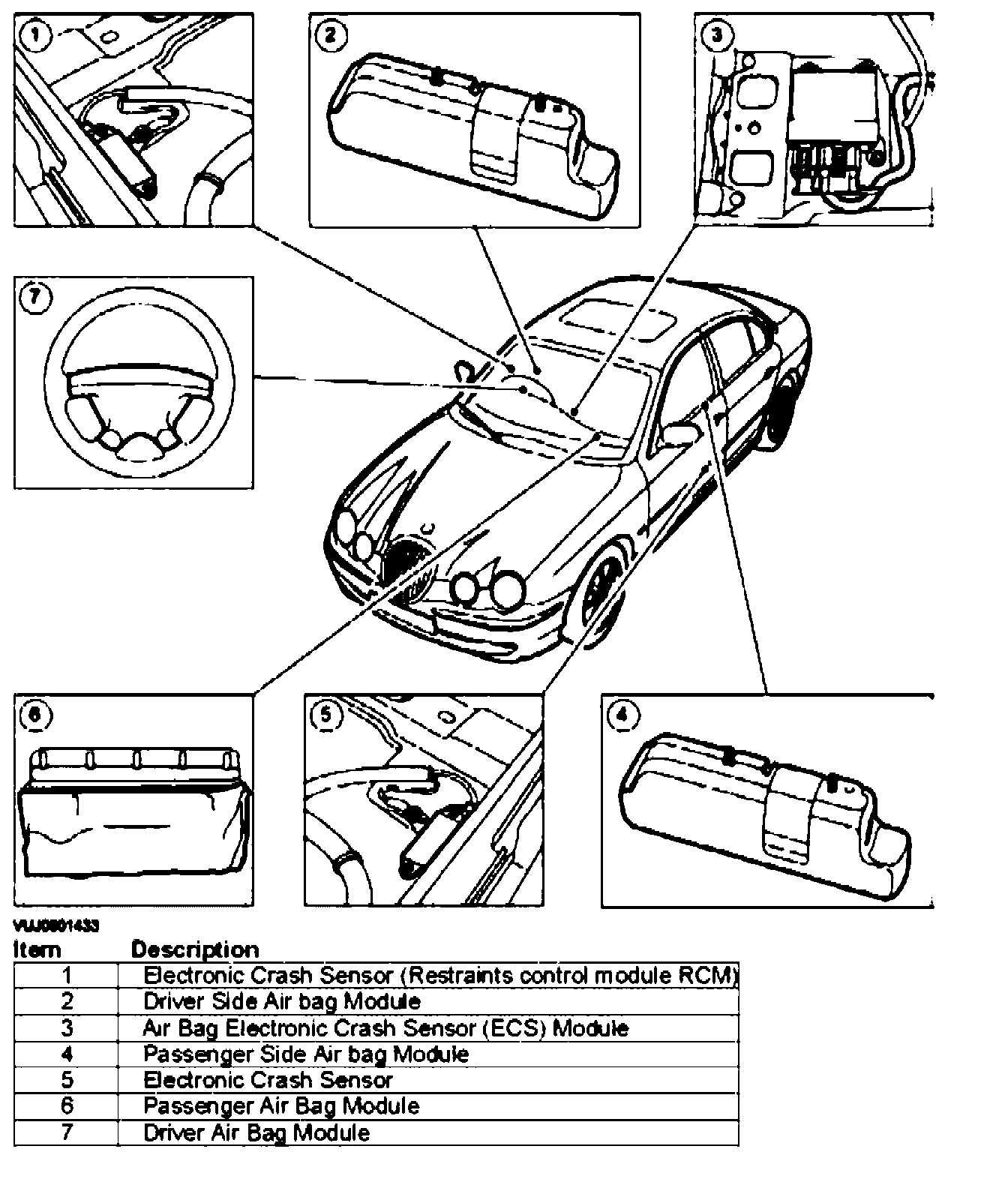 The air bag supplemental restraint system (SRS) components are shown in the following illustration.