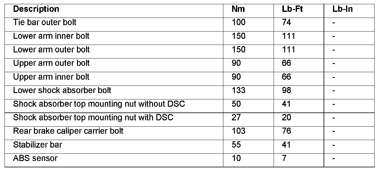 Torque Specifications, Rear Suspension