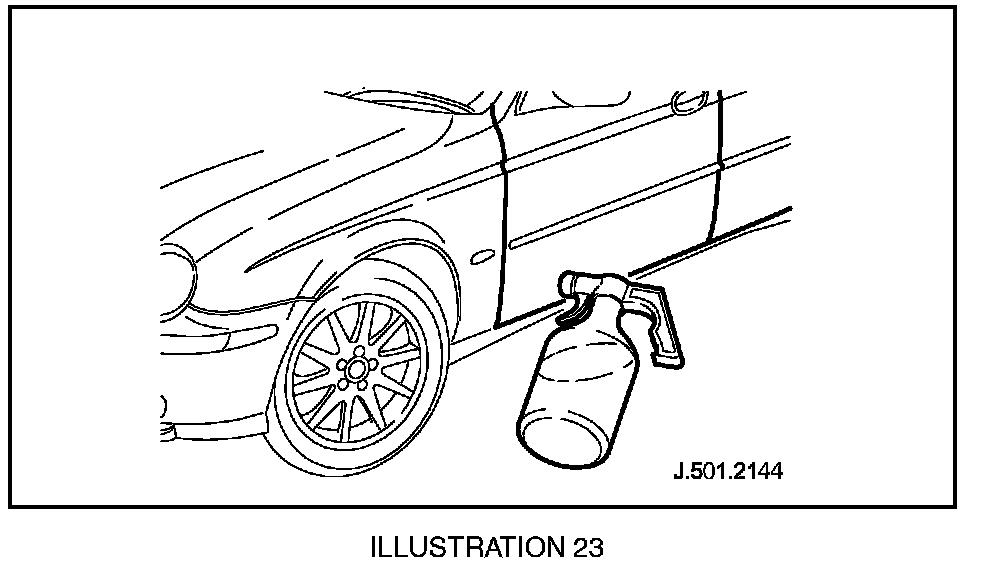 2. From the exterior of the vehicle, direct the spray gun at the lowest point of the suspected leaking area (Illustration 23).